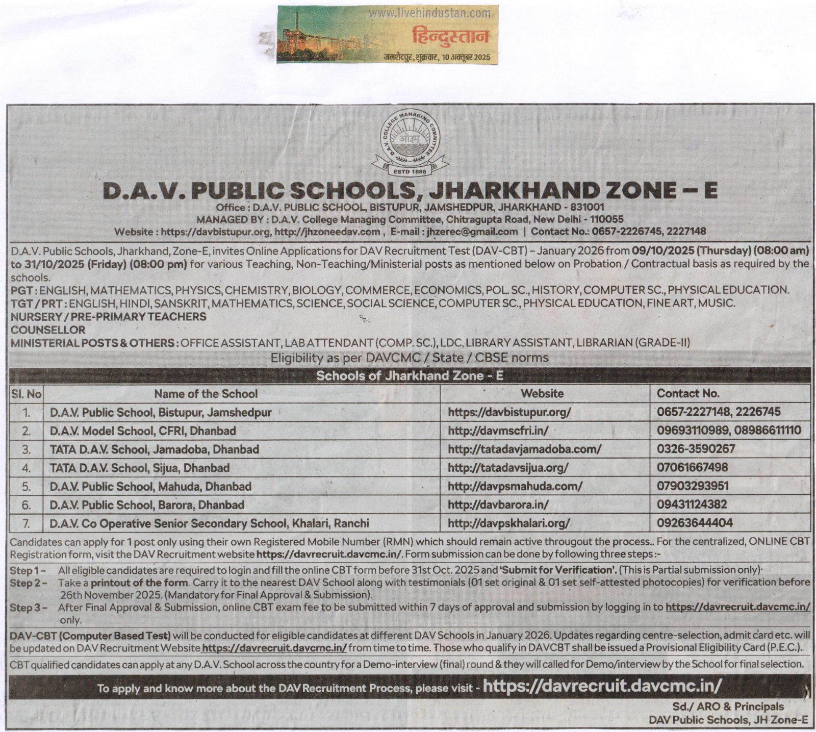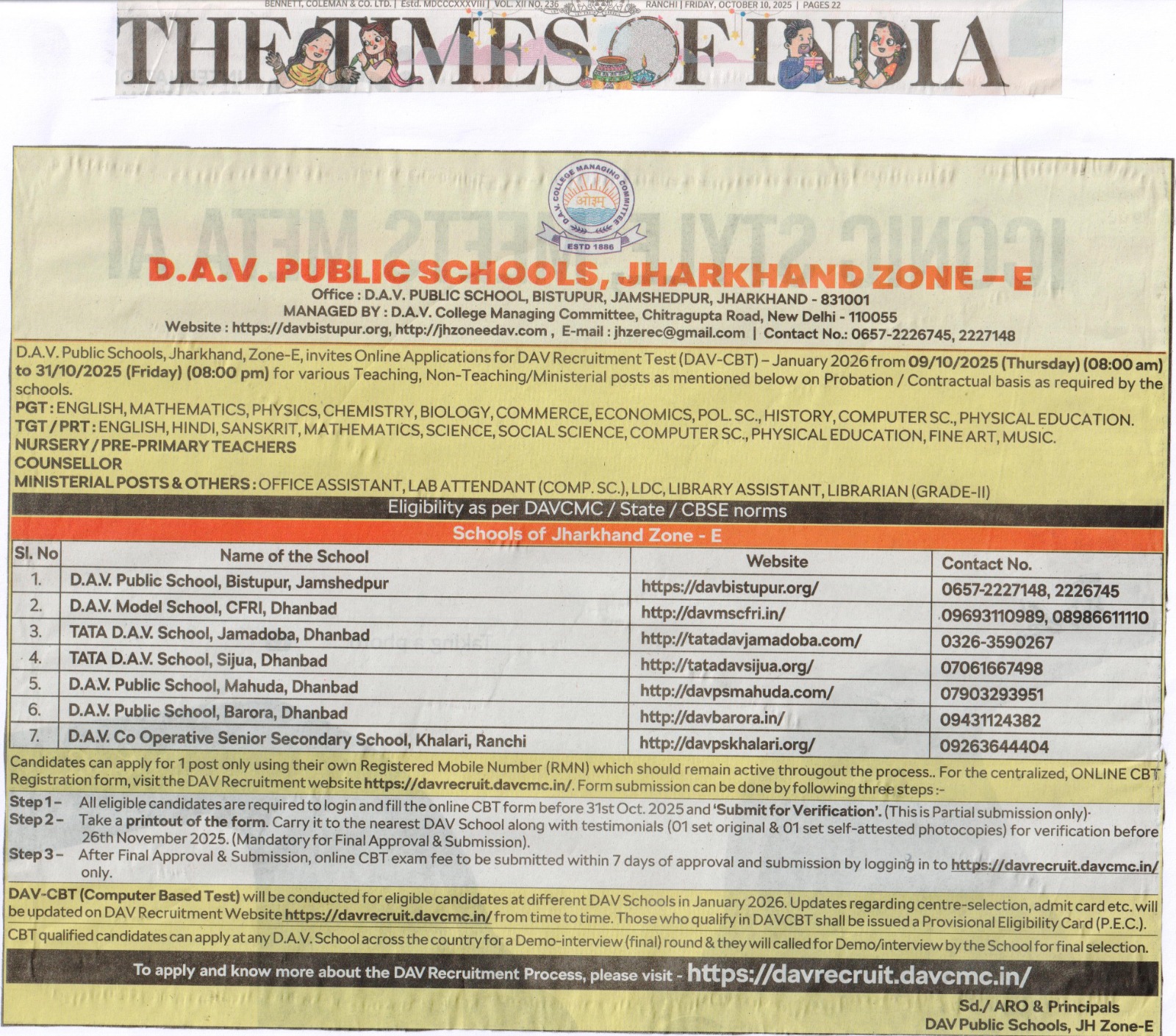 DAV College Trust Management Society, under the aegis of DAV CMC that had taken as challenge, the dreams of TATA STEEL in 1988 to open this school at the cost of DAV’S excellence experience in education, Culture and devotion. All stones were turned to translate the dream. The